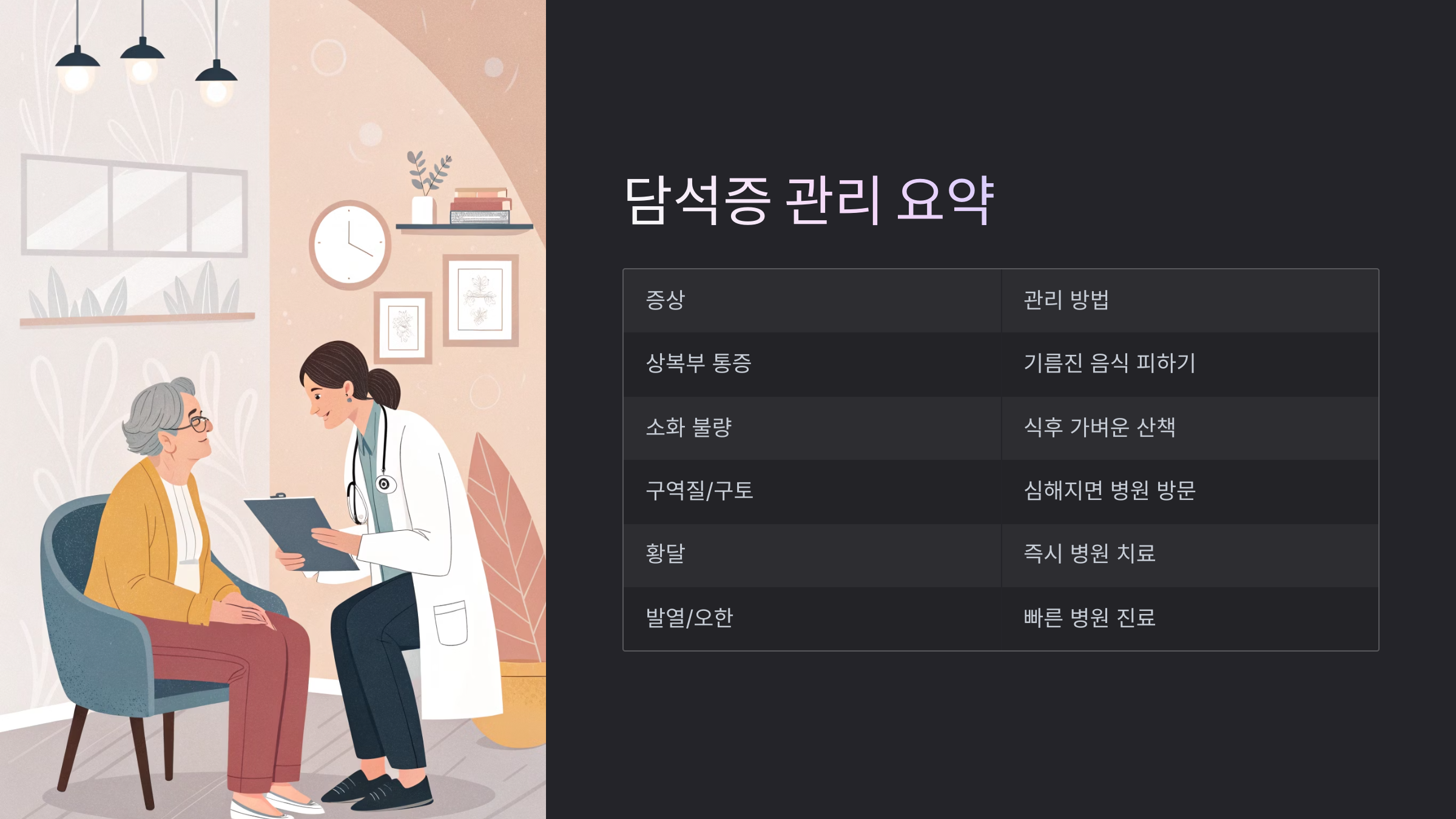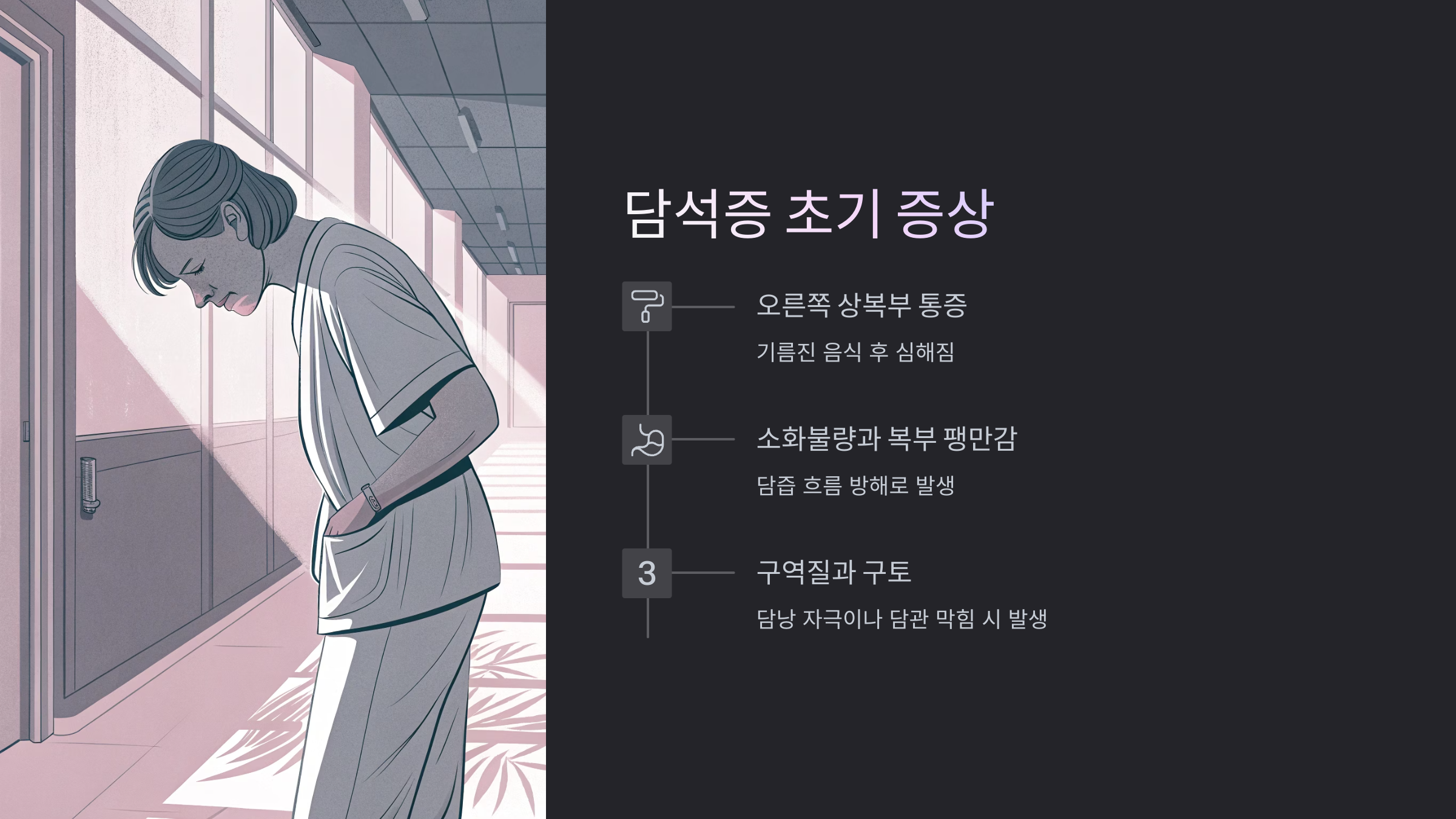 | 오른쪽 상복부 통증 | 담석이 담낭을 자극하거나 담관을 막을 때 발생하는 통증 | 기름진 음식 피하고, 통증이 지속되면 병원 방문 |