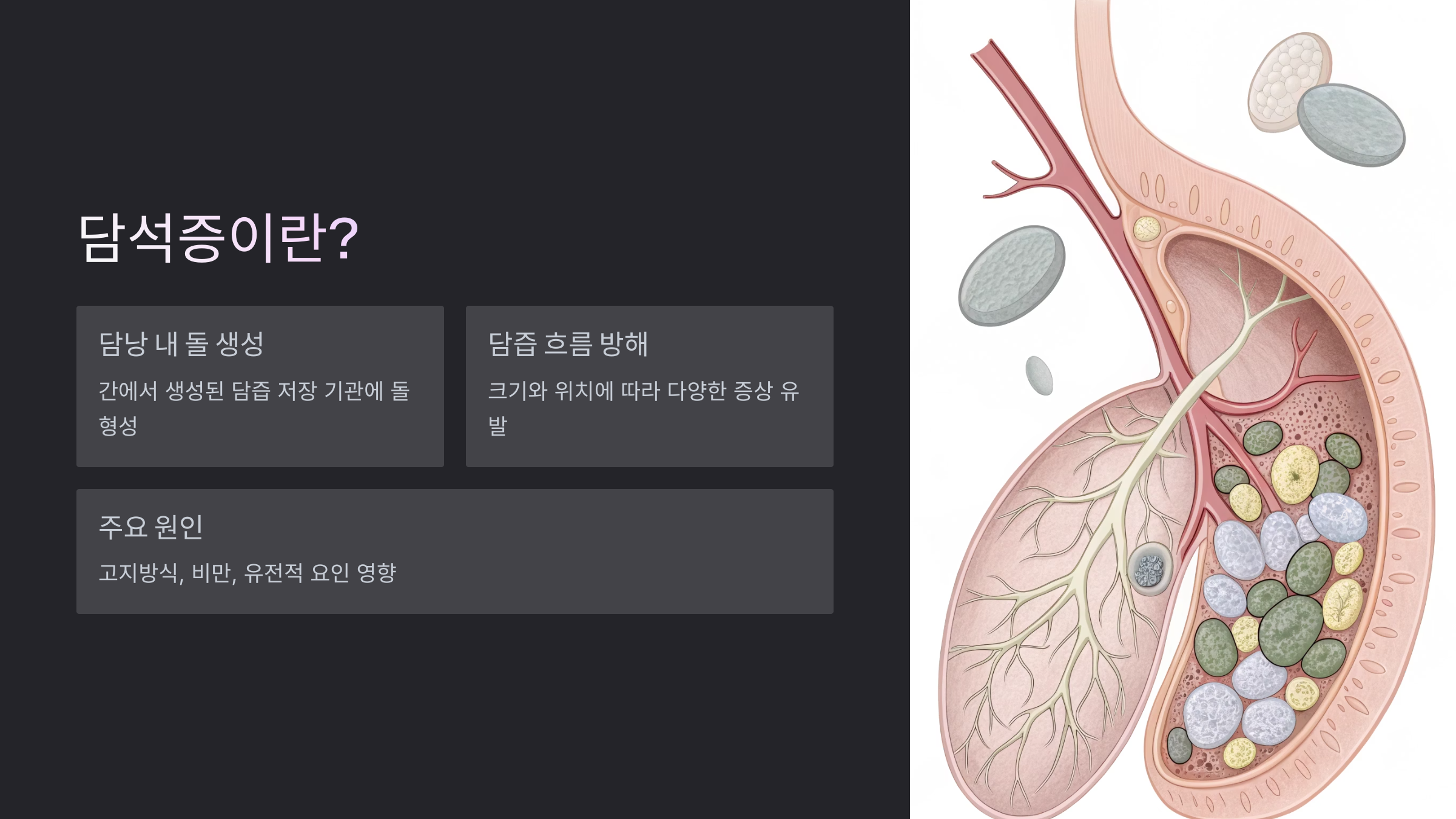 담석증은 담낭 안에 작은 돌이 생기는 질환이다. 담낭은 간에서 생성된 담즙을 저장하는 기관으로, 담석이 담낭 내에 형성되면 정상적인 담즙의 흐름을 방해할 수 있다. 담석은 그 크기와 위치에 따라 다양한 증상을 일으킬 수 있으며, 작은 담석은 증상이 거의 없을 수 있지만, 담석이 커지거나 담관을 막으면 심각한 통증과 합병증을 일으킬 수 있다. 담석증은 주로 고지방식, 비만, 유전적 요인 등이 영향을 미친다.