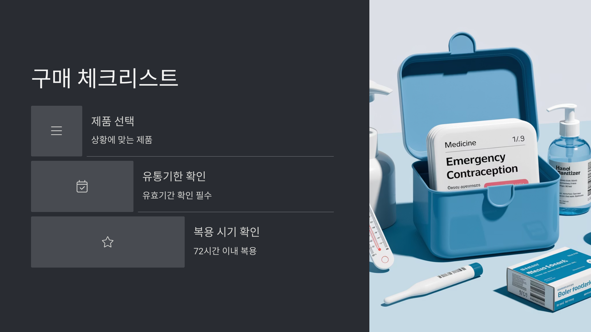 | 복용 시기 확인 | 사후피임약은 빠를수록 효과가 크므로, 복용 시기를 놓치지 않도록 주의해야 한다. |
